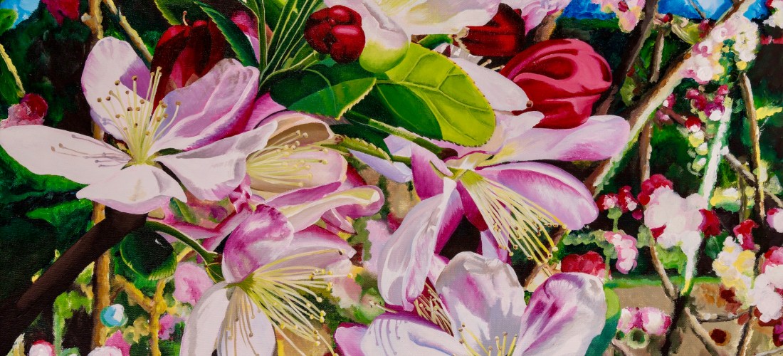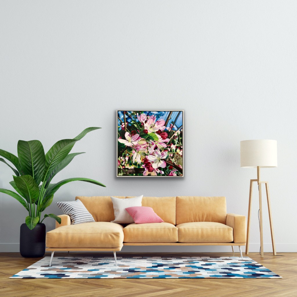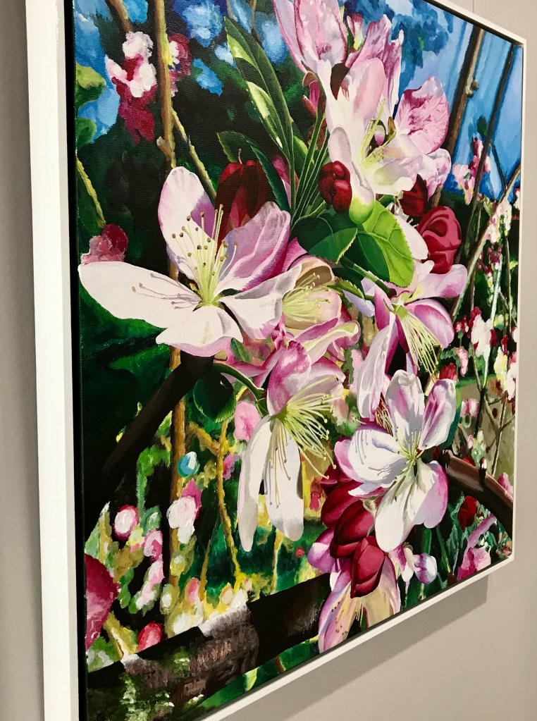 Acrylic on stretched canvas, with painted white Tasmanian oak frame.