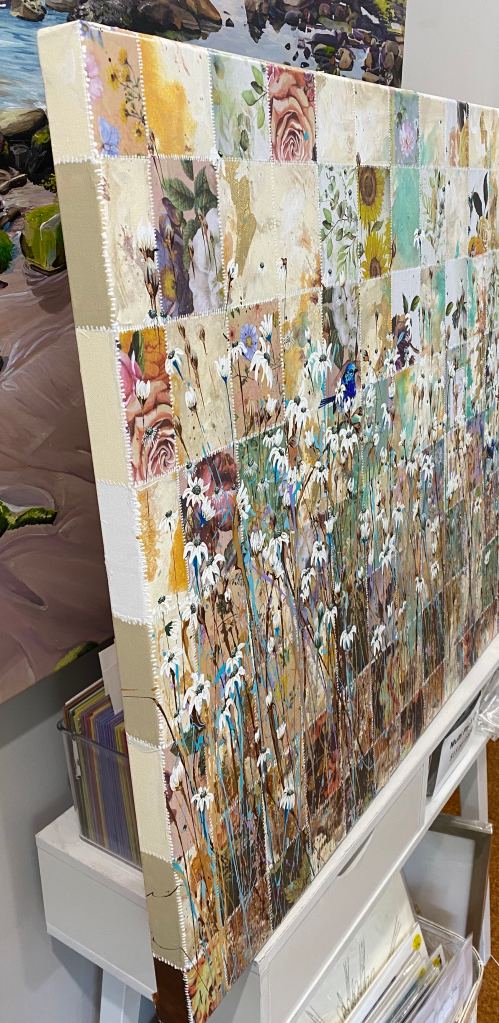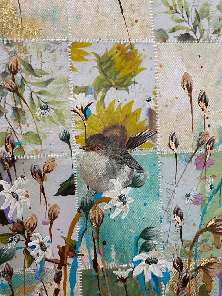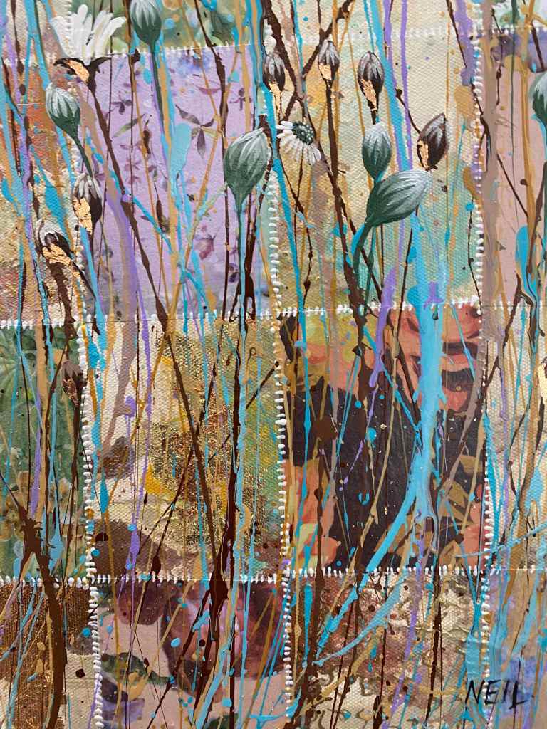 This painting is a part of my motherhood and splatter painting series. The quilt like pattern in the background represents motherhood for me:many parts, both good and bad, intricately woven together to make something beautiful.