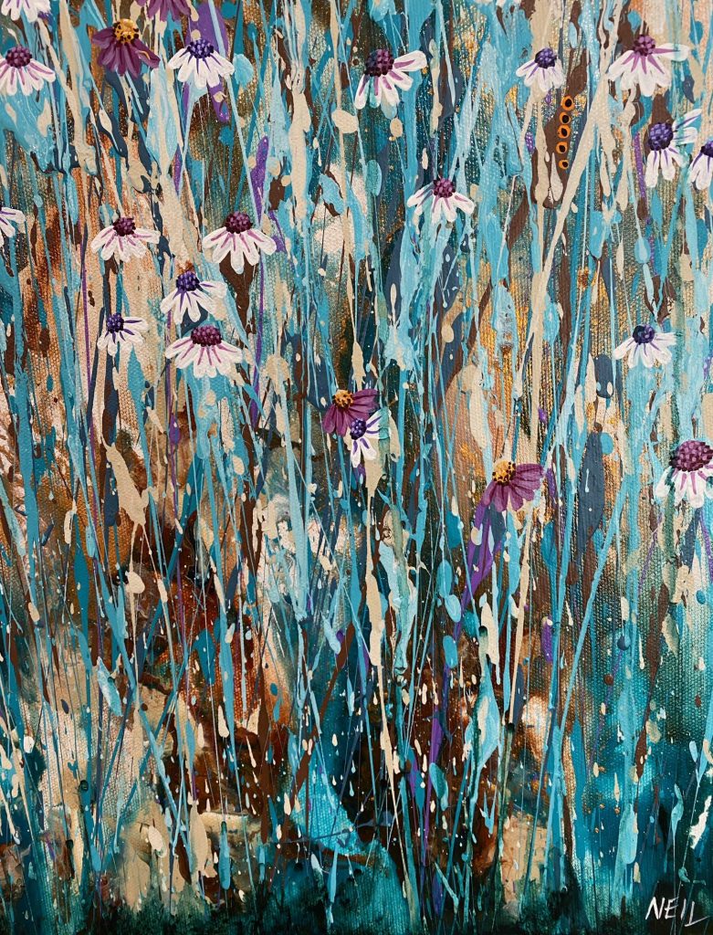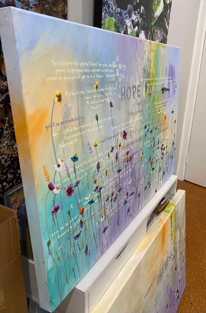 This painting is about my experience as a Mum wanting desperately to fix it, to take the burdens from my kids, to make it better and then hearing a whisper deep in my soul, “some thing’s don’t need to be fixed”.