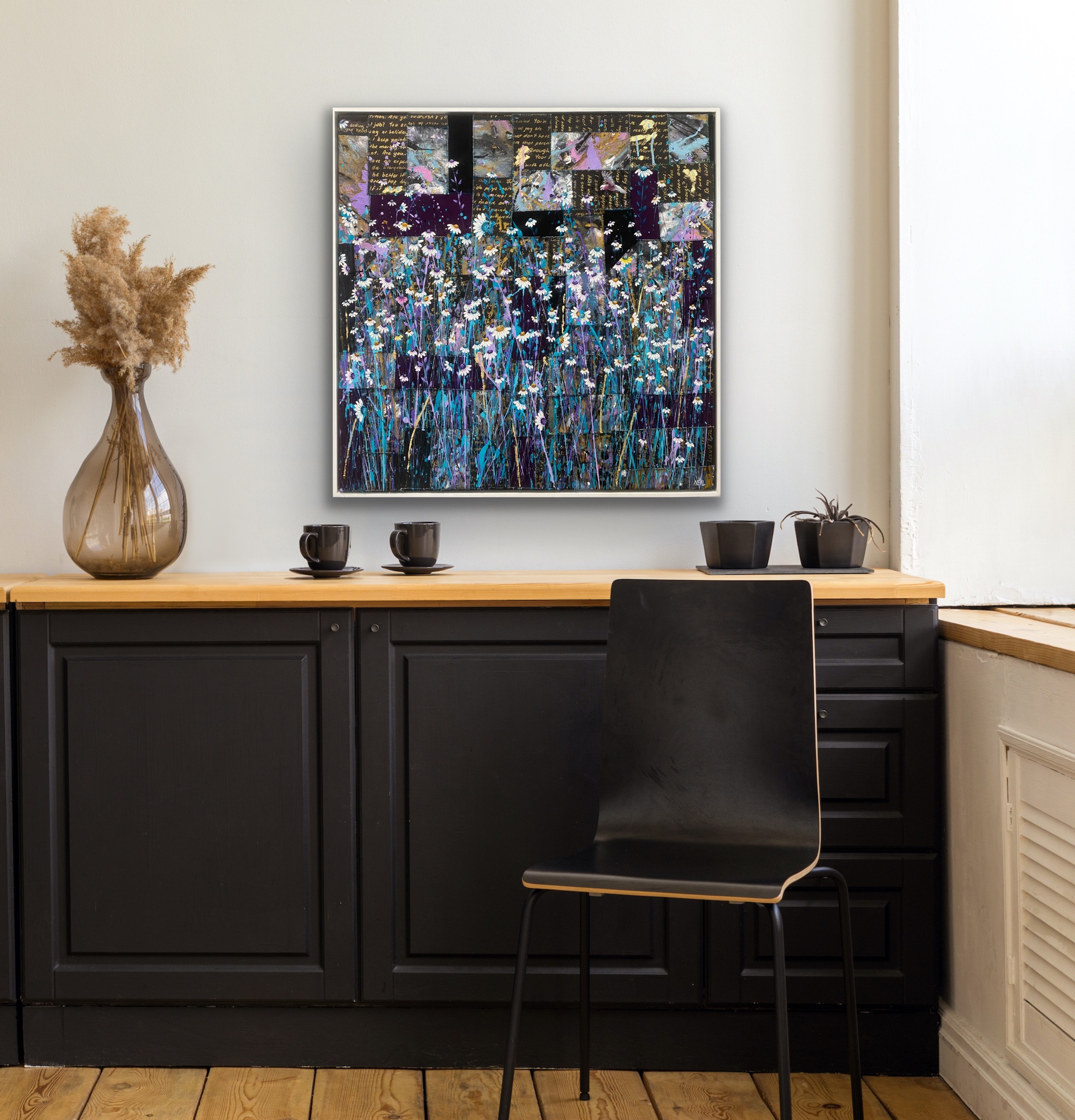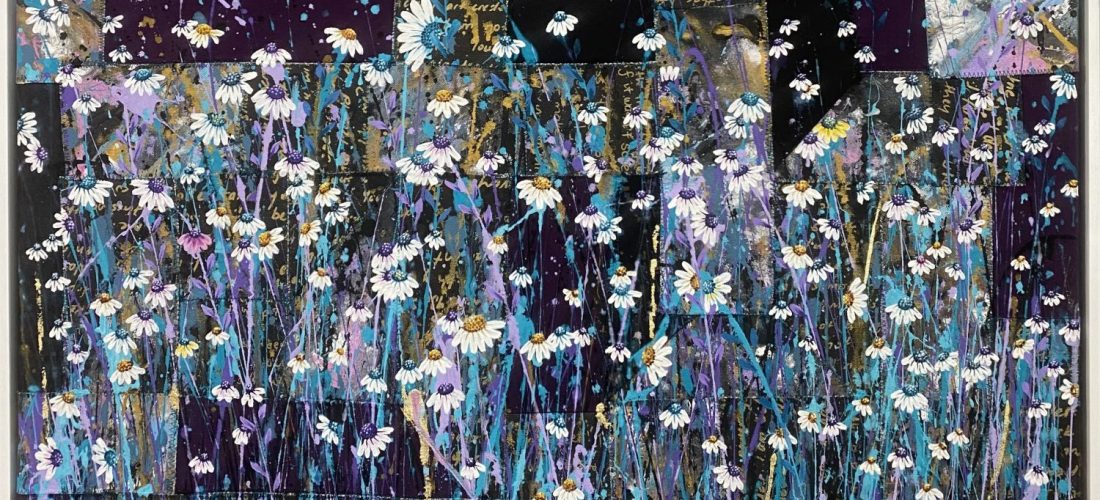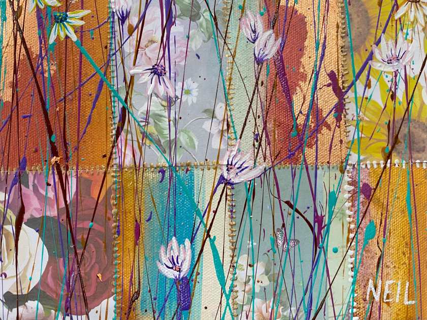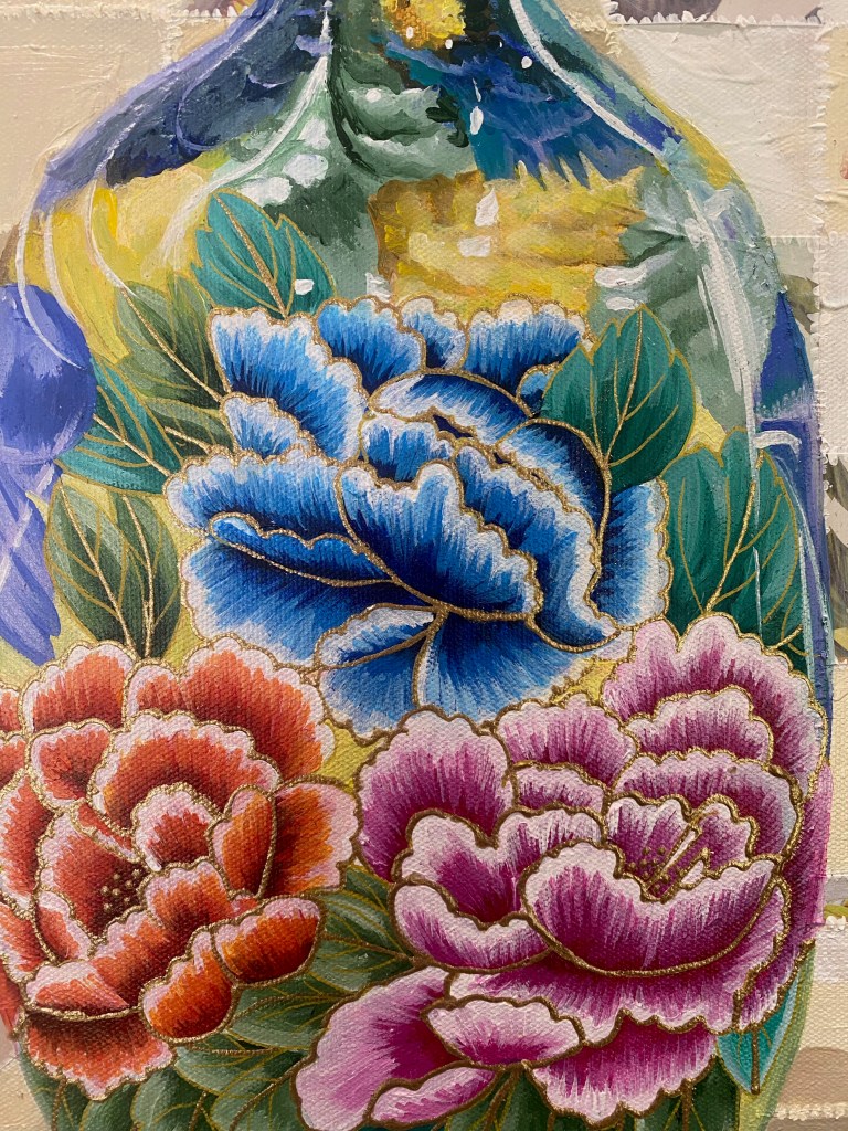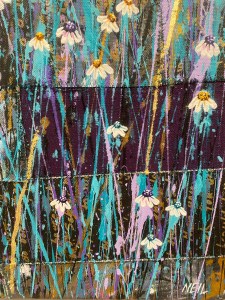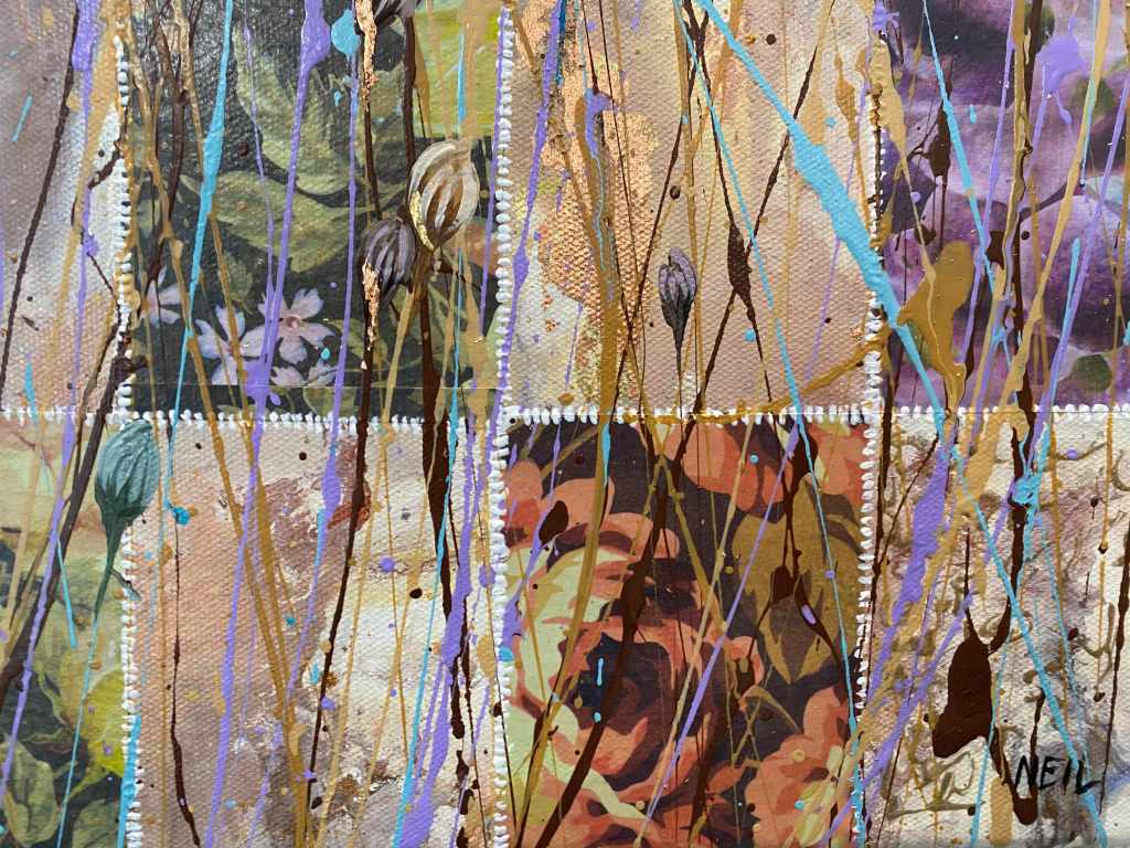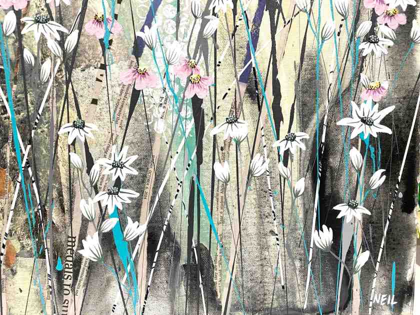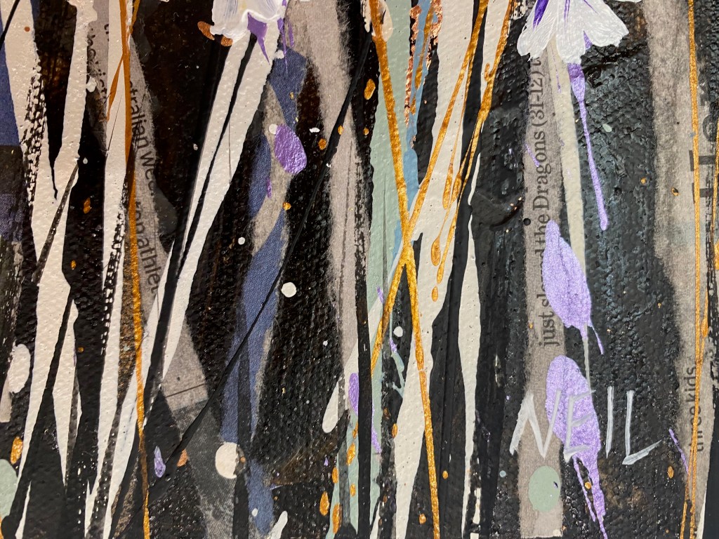 Painting these is pure joy: I literally throw paint on the canvas and then paint what the painting shows me. This one also has scraps of paper, torn up, for stems.