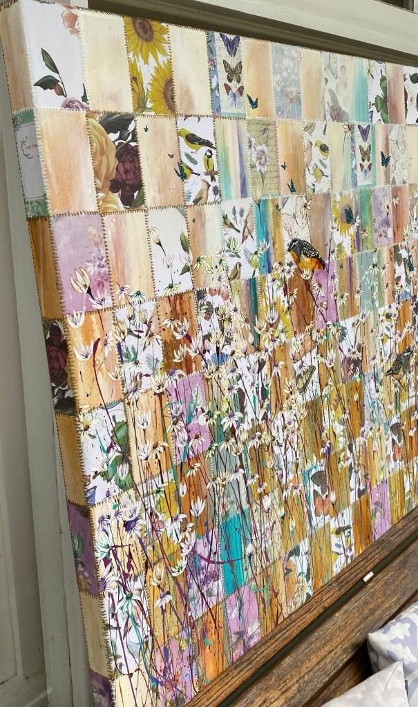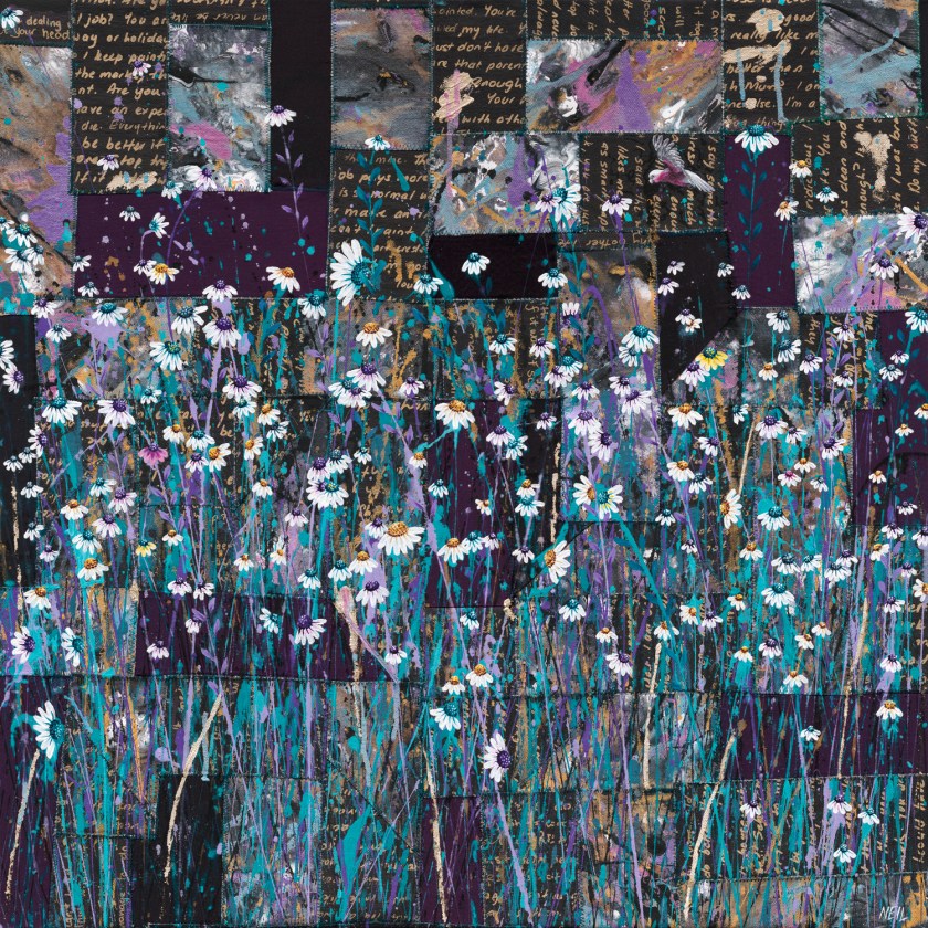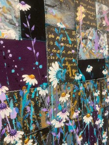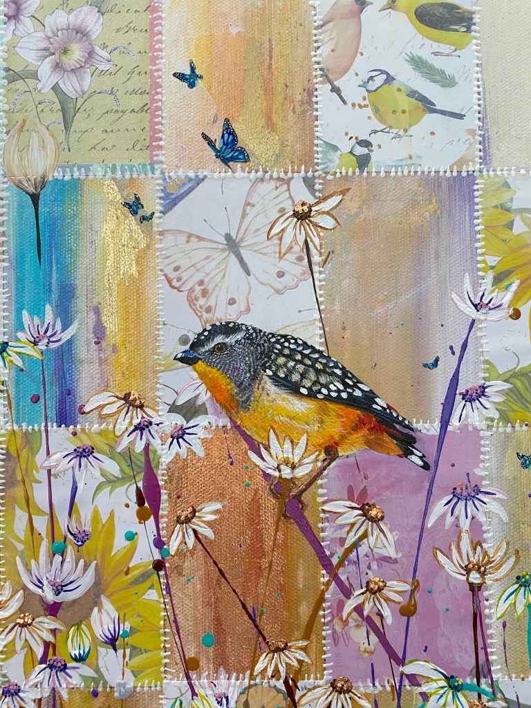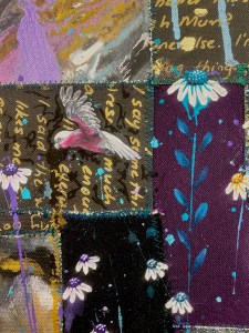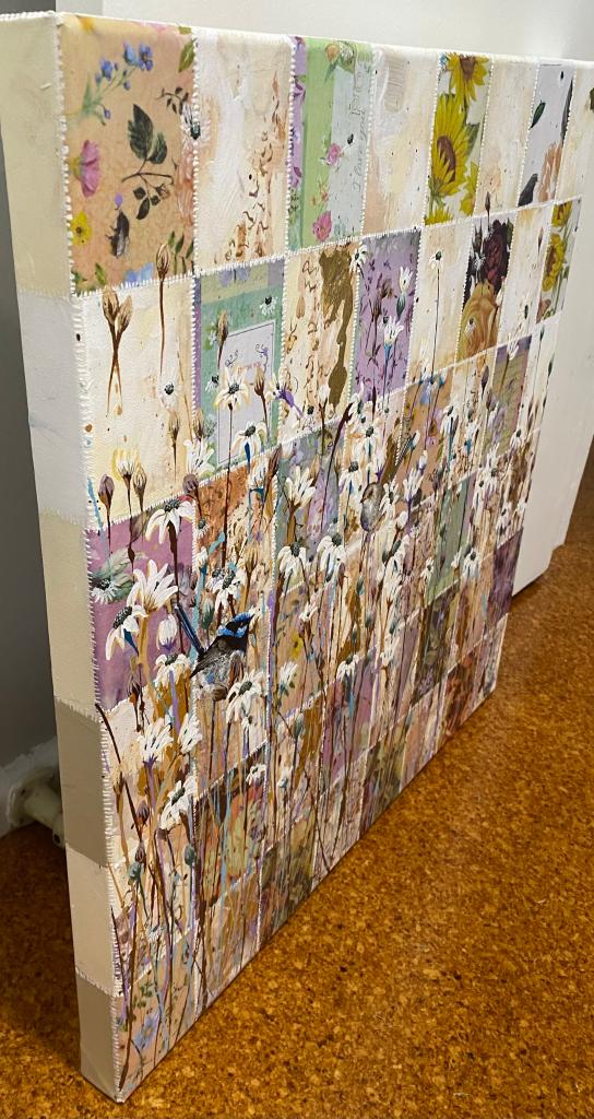 Sewing the pieces back together was the next step. Some were back to front, upside down, sideways, some thrown out. The rest was resown into a new creation, which, while carrying its past, no longer resembles it. The words no longer have meaning. You can not see the pain caused by these comments. We are now free like the galah who soars above the field of flowers.