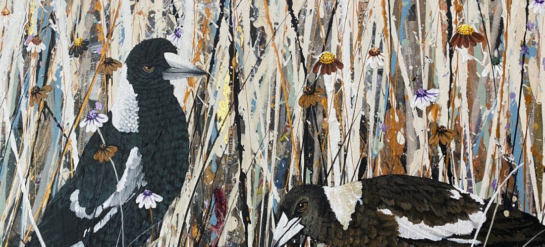 This features part of the beautiful magpie family that visits me almost daily. I sit and get work done and watch them. Magpies get such a bad wrap. They have the most beautiful song and are amazingly bonded families. It really is something special to watch.