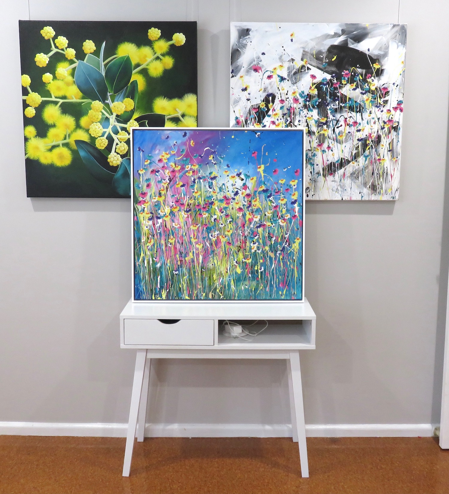 This artwork is framed (lovingly made by me) in a painted white Tasmanian oak floating frame.