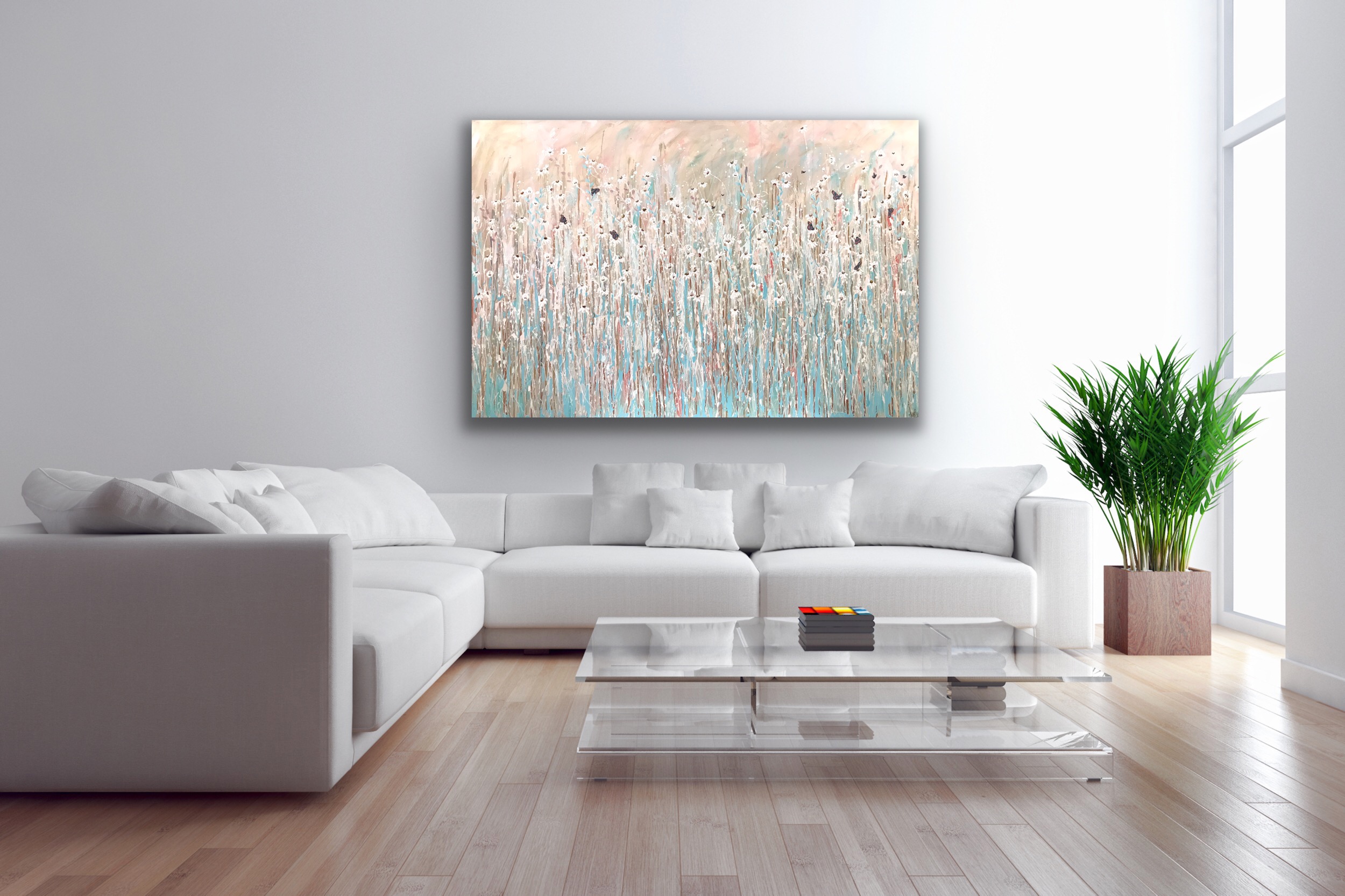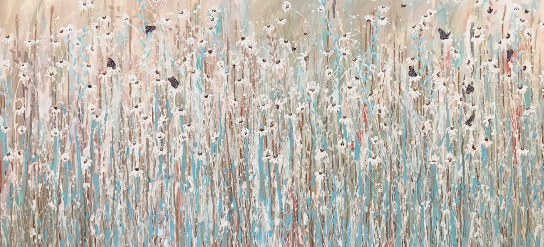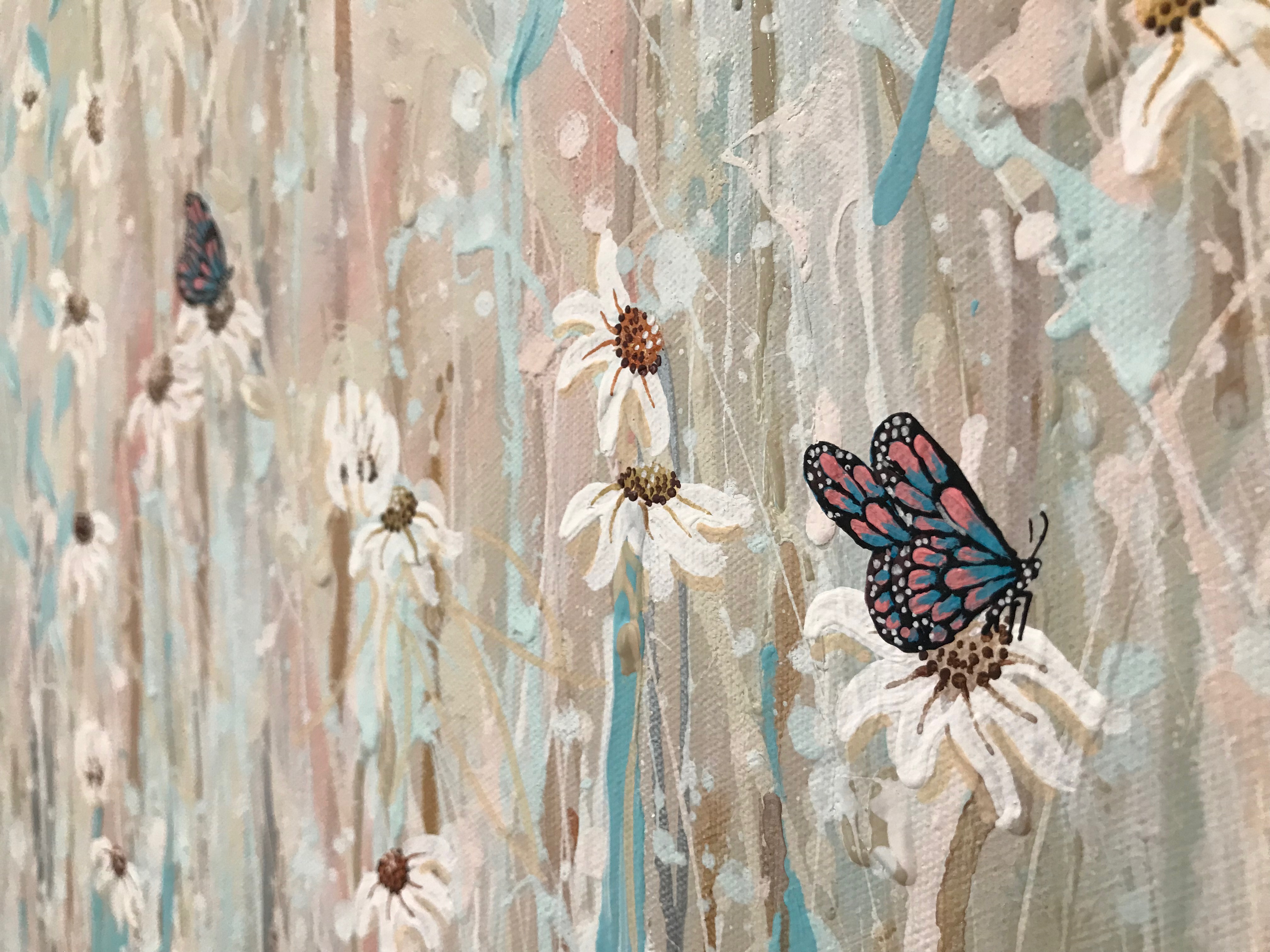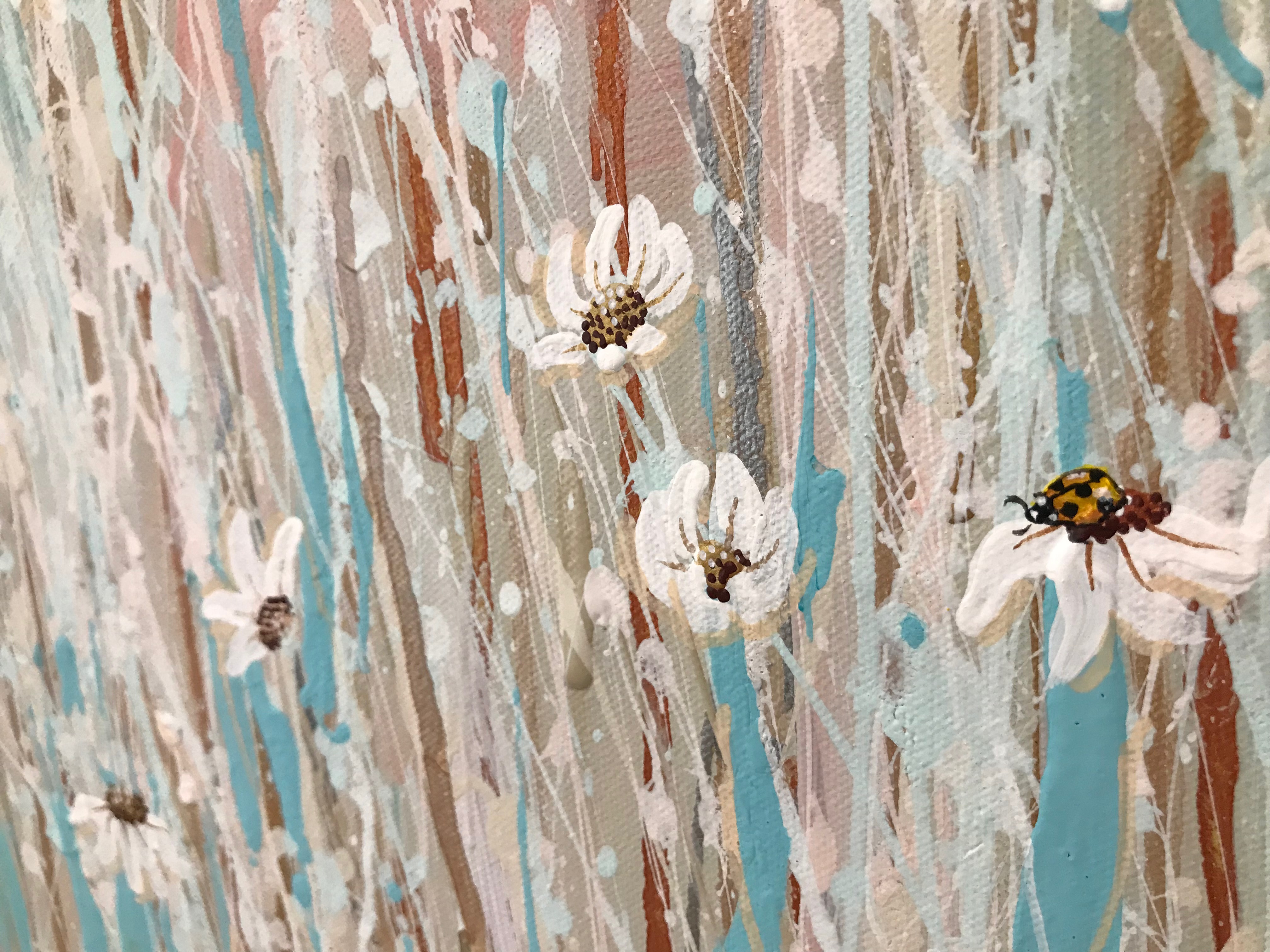 This is a part of my splatter paint series, painting these is pure joy: I literally throw paint on the canvas and then paint what the painting shows me. For this particular piece I thought this was a time we all need a bit of peace, to be reminded about what matters in life, and to just breathe. When I am stressed the first thing I do is to go for a walk and connect with my family and nature. Recently there has been an influx of butterflies and ladybugs, and it has been a wonderful reminder to see the small things which bring us joy: these are hidden amongst the painting.
