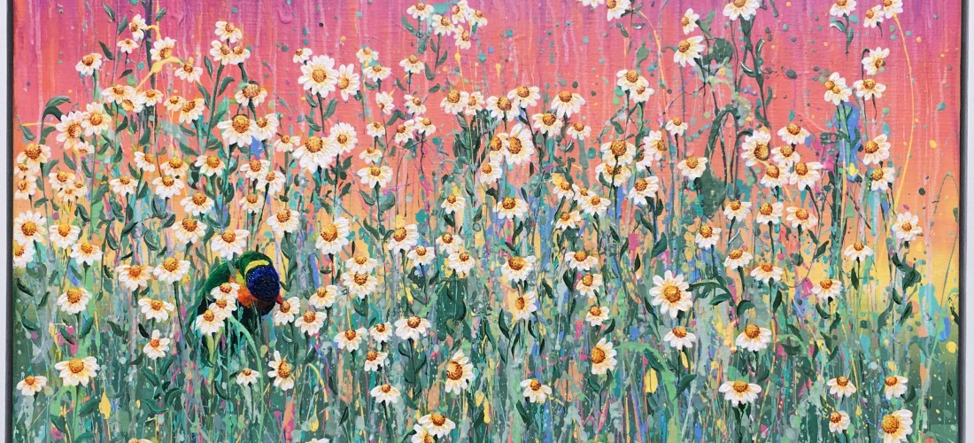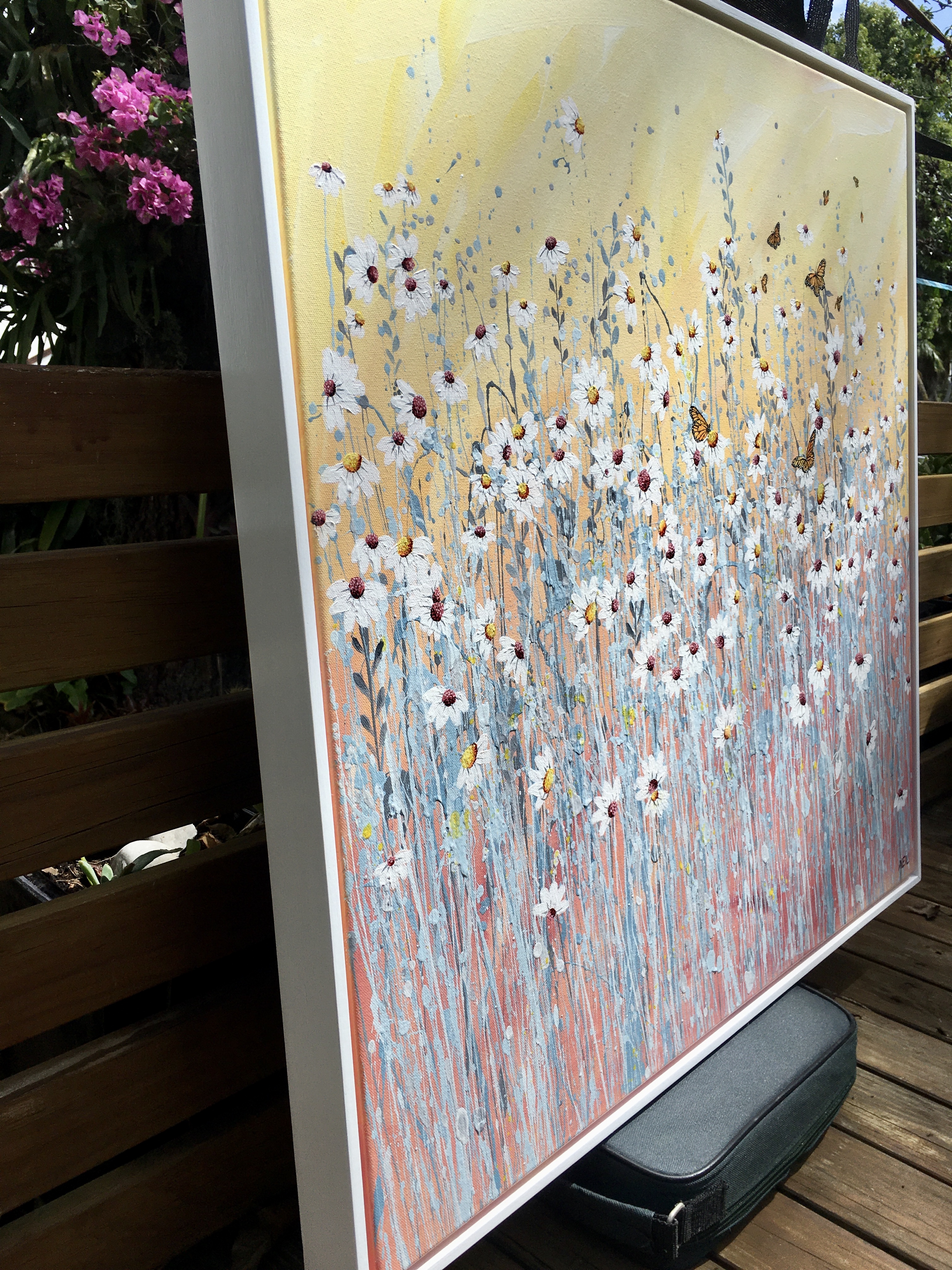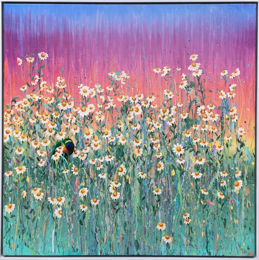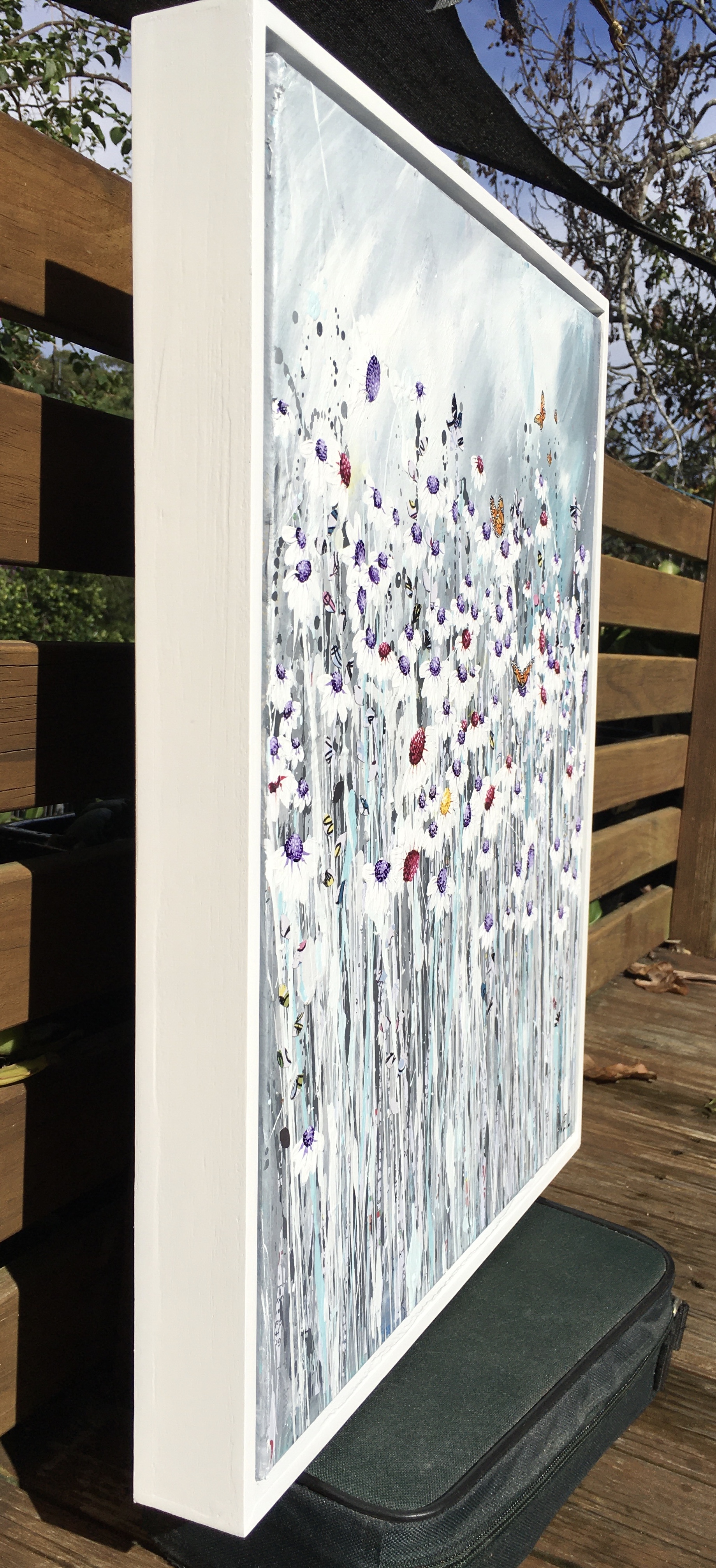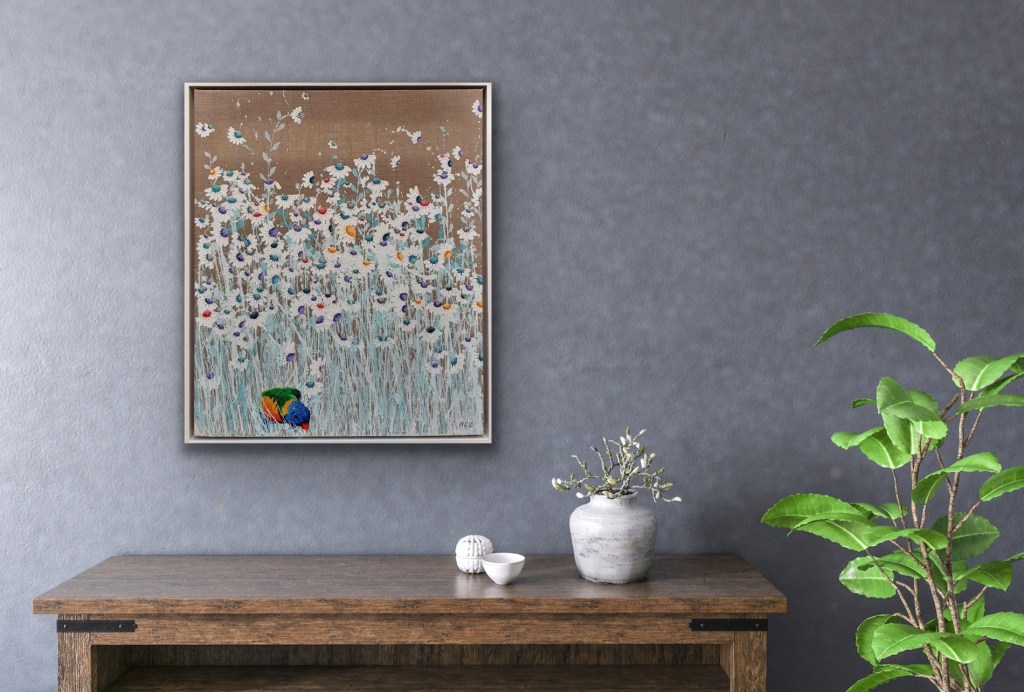 Acrylic on stretched canvas, with painted white Tasmanian oak frame.