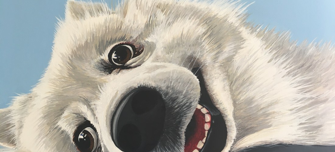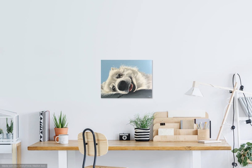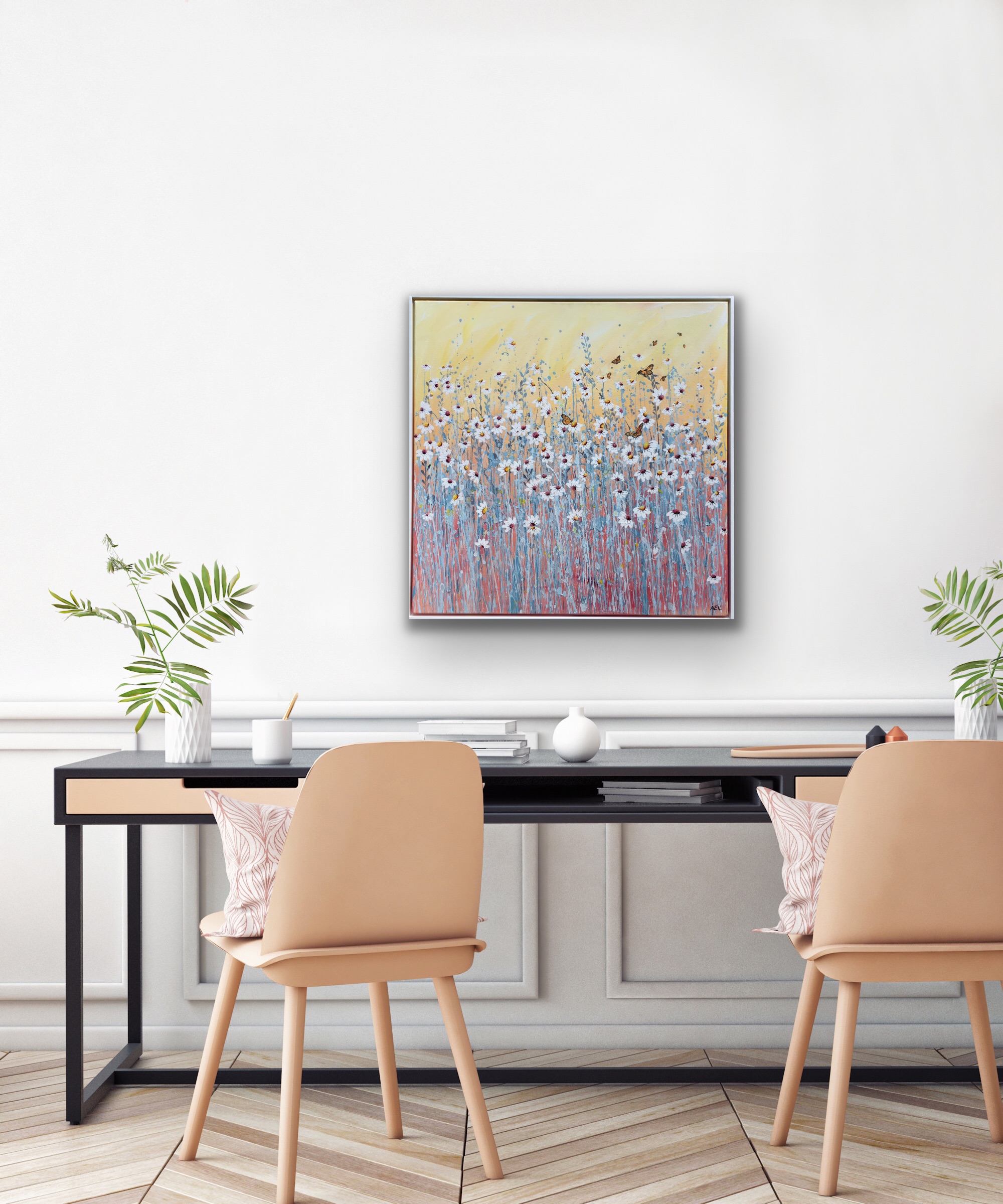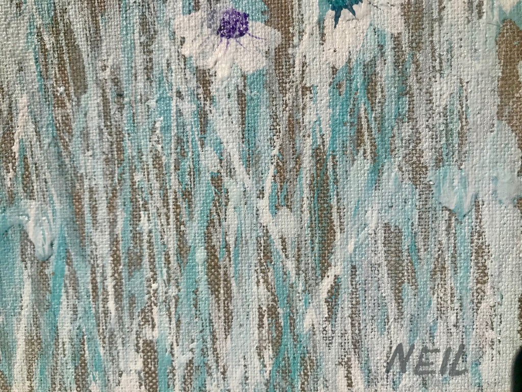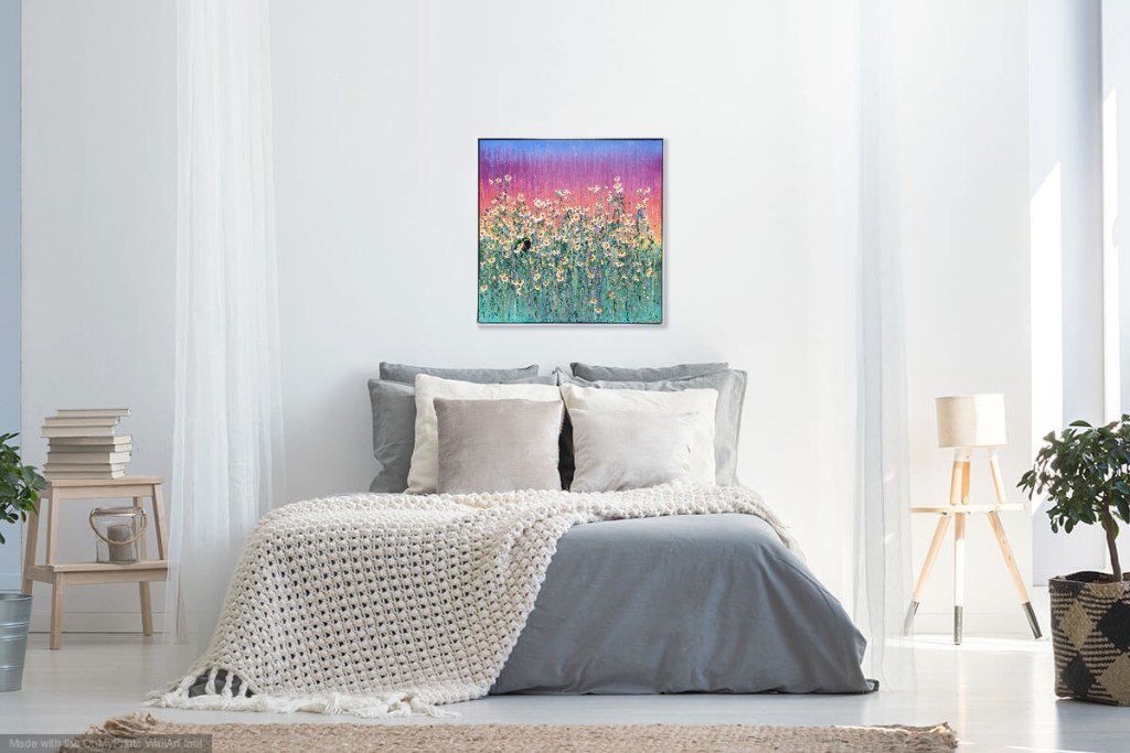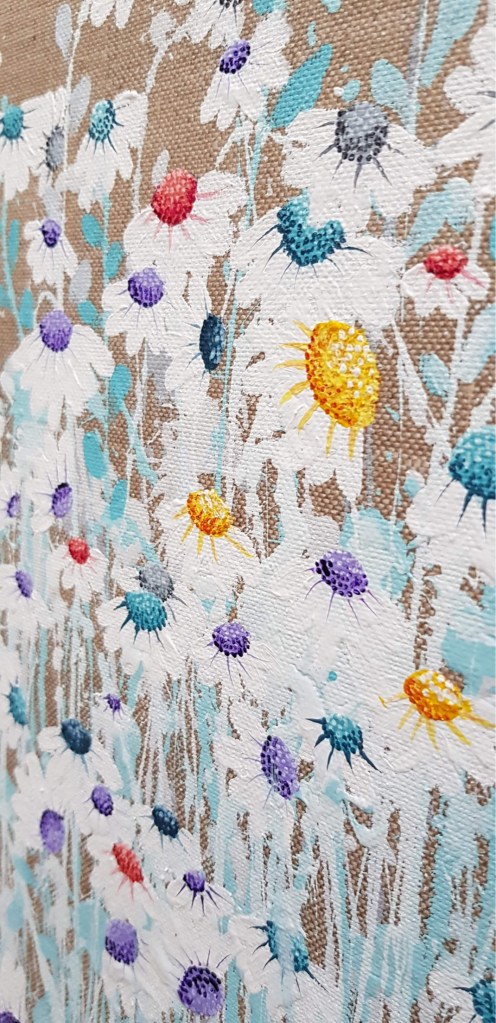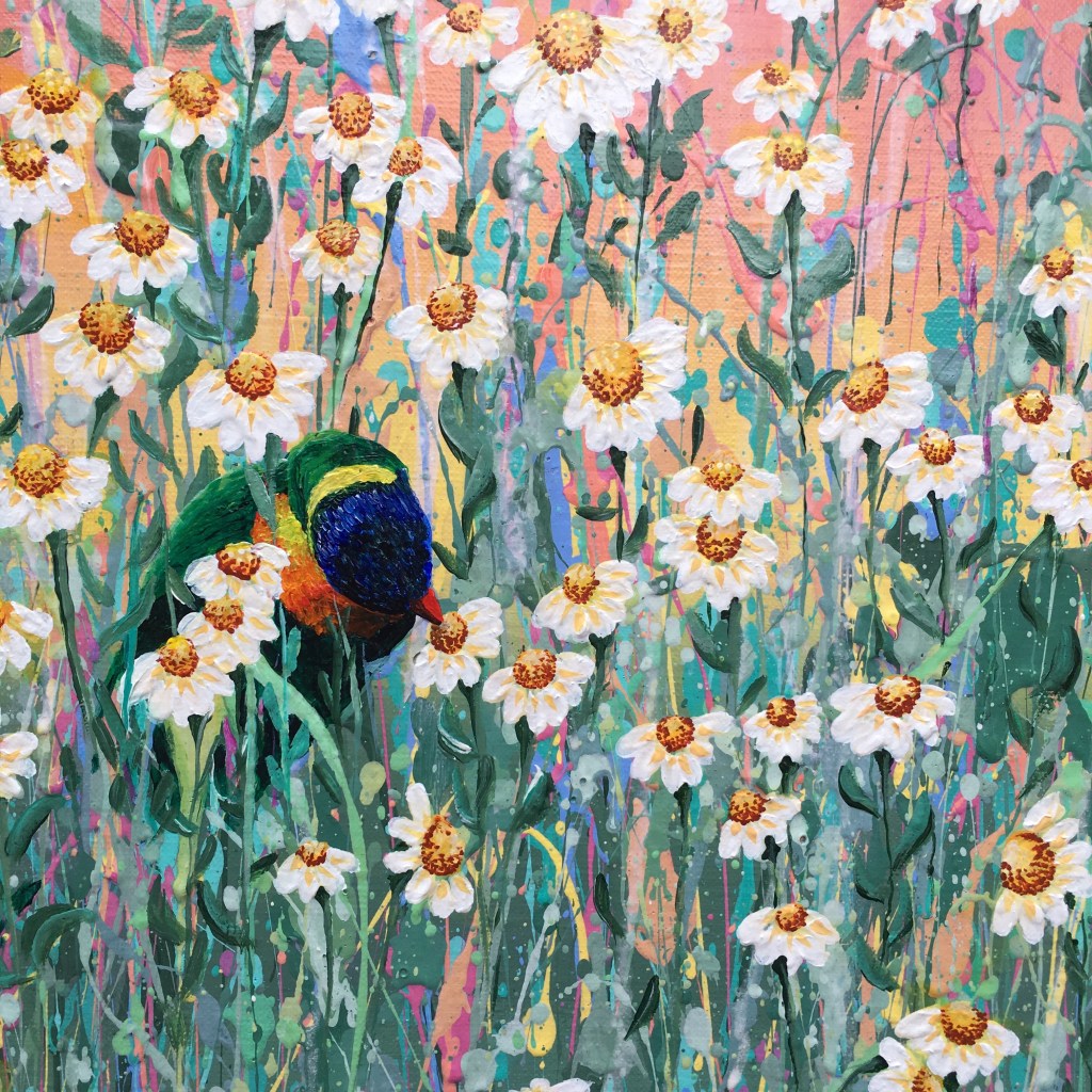 Acrylic on stretched canvas, with painted white Tasmanian oak frame.