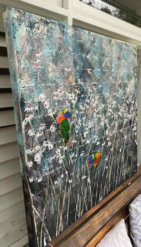 This painting is about my experience as a Mum wanting desperately to fix it, to take the burdens from my kids, to make it better and then hearing a whisper deep in my soul, “some thing’s don’t need to be fixed”.